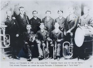 Kerweumzug in Etschberg, vorbei an dem Anwesen Kreutz, das mit dem Musikantengeld der sieben Brüder Kreutz als stattliches Bauernhaus errichtet wurde. Die USA waren wohl ein fruchtbares Arbeitsfeld! (PE)