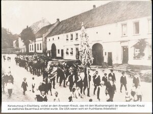 Kerweumzug in Etschberg, vorbei an dem Anwesen Kreutz, das mit dem Musikantengeld der sieben Brüder Kreutz als stattliches Bauernhaus errichtet wurde. Die USA waren wohl ein fruchtbares Arbeitsfeld! (PE)