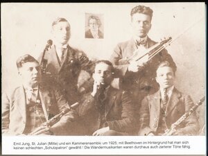 Emil Jung, St. Julian (Mitte) und ein Kammerensemble um 1925; mit Beethoven im Hintergrund hat man sich keinen schlechten „Schutzpatron“ gewählt! Die Wandermusikanten waren durchaus auch zarterer Töne fähig. (PE)