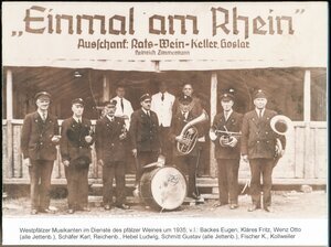 Westpfälzer Musikanten im Dienste des pfälzer Weines um 1935; v.l.: Backes Eugen, Kläres Fritz, Wenz Otto (alle Jettenbach), Schäfer Karl, Reichenbach, Hebel Ludwig, Schmitt Gustav (alle Jettenbach), Fischer Karl, Kollweiler (PE)