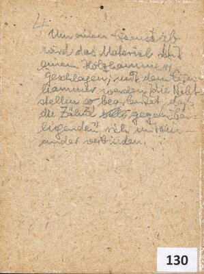 Neun Stationen des Werdeganges einer Trompete: 4. Mit einem Holzhammer wird das Material um einen Eisenstab geschlagen; die Nahtstellen werden mit einem Eisenhammer so bearbeitet, dass die gegenüberliegenden Zähne sich miteinander verbinden. (PE)