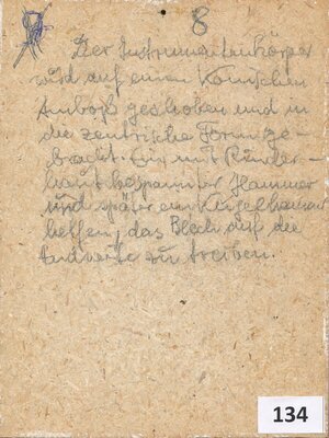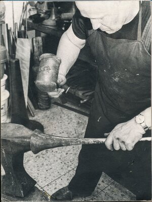 Neun Stationen des Werdeganges einer Trompete: 8. Der Instrumentenkörper wird auf einen konischen Amboß geschoben und in die zentrische Form gebracht. Ein mit Rinderhaut gespannter Hammer und später ein Kugelhammer helfen, das Blech auf die Endweite zu treiben. (PE)