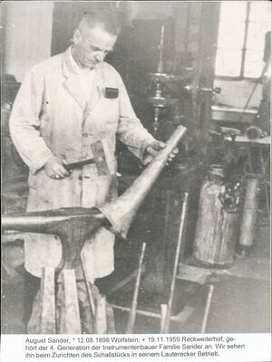 August Sander, * 12.08.1898 Wolfstein, + 19.11.1959 Reckweilerhof, gehört der 4. Generation der Instrumentenbauer Familie Sander an. Wir sehen ihn beim Zurichten des Schallstücks in seinem Lauterecker Betrieb. (PE)