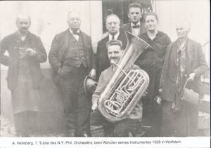 A. Helleberg, 1. Tubist des New York Philharmonic Orchesters, beim Abholen seines Instrumentes 1928 in Wolfstein. (PE)