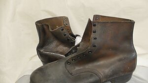 Ein Einzelner Dunkelbrauner Herren-Stiefel aus Leder und Filz. Der Schuh hat eine Runde Form, einen matallgenagelten Absatz (4 cm) und einen Plateau von 3,5 cm. Er verfügt über einen Riemen aus Leder mit Schnallenverschluss, bei dem jedoch eine Schnalle fehlt. An der Sohle befindet sich Leder und sie ist metallgenagelt.
