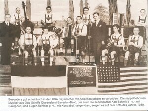 Besonders gut scheint sich in den USA [Australien!?] Bayerisches mit Amerikanischem zu verbinden! Die seppelbehosten Musiker aus Otto Schuffs Queensland-Bavarian-Band, der auch die Jettenbacher Karl Schmitt (1.v.r. mit Saxophon) und Eugen Ziehmer (1.v.l. mit Kontrabass) angehören, zeigen es auf dem Foto des Jahres 1930. (PE)