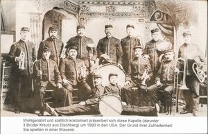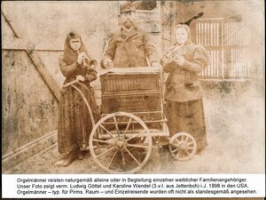 Orgelmänner reisten naturgemäß alleine oder in Begleitung einzelner weiblicher Familienangehöriger. Unser Foto zeigt vermutlich Ludwig Göttel und Karoline Wendel (3.v.l. aus Jettenbach) im Jahr 1898 in den USA. Orgelmänner – typisch für den Pirmasenser Raum – und Einzelreisende wurden oft nicht als standesgemäß angesehen. (PE)