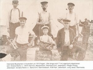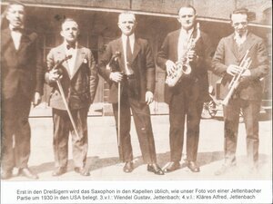 Erst in den 1930ern wird das Saxophon in den Kapellen üblich, wie unser Foto von einer Jettenbacher Partie um 1930 in den USA belegt. 3.v.l.: Wendel Gustav, Jettenbach; 4.v.l.: Kläres Alfred, Jettenbach. (PE)