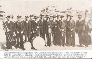 „Noch schnell ein Erinnerungsfoto im Hafen von Rotterdam vor der Abreise (1898) nach Südafrika“ heißt es für die Musikanten aus Eßweiler, Jettenbach, Hinzweiler, Wolfstein und Einöllen. Bekannt sind 3.v.l.: Leonhard Edmund, Jettenbach und 6.v.l.: Schäfer Otto, Jettenbach. Wer kennt die übrigen Kollegen? (PE)