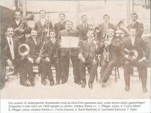 Für unsere 12 Jettenbacher Musikanten muss es eine Ehre gewesen sein, unter einem solch „gewichtigen“ Dirigenten in den USA um 1900 spielen zu dürfen. Hintere Reihe v.l.: 1. Pfleger Julius, 2. Fuchs Albert, 5. Pfleger Julius; vordere Reihe v.l.: Fuchs Eduard, 3. Bock Berthold, 6. Leonhard Edmund, 7. Klein (PE)