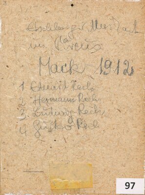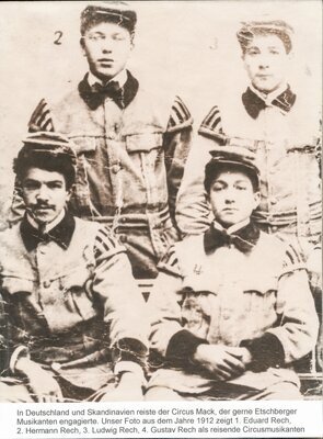 In Deutschland und Skandinavien reiste der Circus Mack, der gerne Etschberger Musikanten engagierte. Unser Foto aus dem Jahre 1912 zeigt 1. Eduard Rech, 2. Hermann Rech, 3. Ludwig Rech, 4. Gustav Rech als reisende Circusmusikanten. (PE)