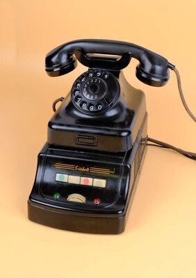 Bei diesem Objekt handelt es sich um einen Telefonverstärker der Firma Surhold Apparatebau KG aus Düsseldorf. Es ist wohl ein seltenes Gerät, da die Informationslage dürftig ist. Es handelt sich um ein Tischgerät mit 220 Volt Anschlusskabel. Das Gerät ist so gebaut, dass ein Bundespost Telefon auf die Oberfläche gestellt und direkt per Kabel angeschlossen werden kann. Das Gehäuse besteht rot/braun gefärbtem Bakelit und dürfte aus den 1950/1960er Jahre stammen. Dieses Gerät kam primär in Büros zum Einsatz An der schräg angeschnittenen Vorderseite befinden sich 4 Drucktasten. Je einer mit einem grünen und roten Punkt sowie zwei weiße. Darunter angeordnet sind zwei kleine Leuchten, jeweils eine in grün und rot. In der Mitte der Beiden ist ein Drehregler eingebaut, der wohl der Lautstärkenregelung dient. Die Funktionsweise konnten wir nicht in Erfahrung bringen. Jedoch finden wir auf einer Zeitgenössischen Bestellpostkarte die Vorteile aufgelistet.