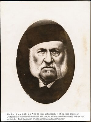 Hubertus Kilian, * 09.03.1827 Jettenbach, + 14.10.1899 Eßweiler; weitgereister Pionier der Frühzeit, der die „musikalischen Weltmärkte“ öffnen half; erhielt den Titel „kaiserlich chinesischer Militärkapellmeister“ (PE)