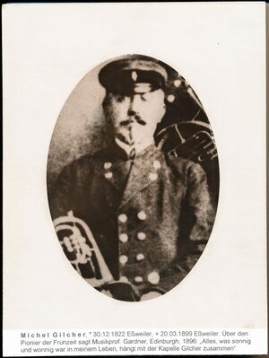 Michel Gilcher, * 30.12.1822 Eßweiler, + 20.03.1899 Eßweiler. Über den Pionier der Frühzeit sagt Musikprofessor Dr. George Gardner, Edinburgh, 1896 zu Besuch: „Alles, was sonnig und wonnig war in meinem Leben, hängt mit der Kapelle Gilcher zusammen. Aus ewiger Freundschaft!“ (PE)