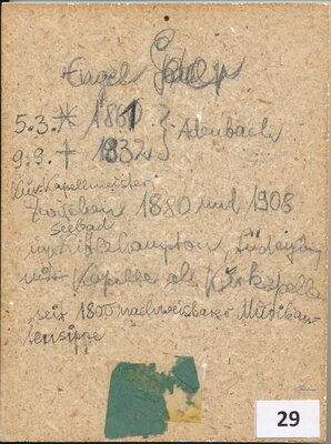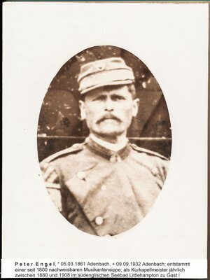 Peter Engel, * 05.03.1861 Adenbach, + 09.09.1932 Adenbach; entstammt einer seit 1800 nachweisbaren Musikantensippe; als Kurkapellmeister jährlich zwischen 1880 und 1908 im südenglischen Seebad Littlehampton zu Gast! (PE)