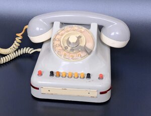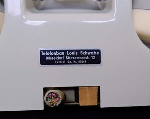 Bei diesem Telefon handelt es sich um eine kleine Vermittlungsanlage, eingerichtet für 4 Amtsleitungen. Hergestellt von der Firma DFG (Deutsche Fernsprech Gesellschft) aus Frankfurt-Heusenstamm und Berlin. Die am Boden aufgedruckte Typenbezeichnung lautet: STA 19-109 A5 und 508116. Obwohl die Firma DFG bei der Bundespost als Lieferant aufgeführt ist (Kürzel „l“) ist dieser Apparat nicht zu finden. Das Telefon besitzt an der vorderen Kante 9 Druckknöpfe in unterschiedlichen Farben. Die 4 Gelben gehören zu je einer der 4 Amtsleitungen. Des Weiteren gibt es noch 2 rote, 2 schwarze und 1 brauner Druckknopf, deren Funktionsweisen uns aber im Einzelnen nicht bekannt sind. Die Wählscheibe ist durchsichtig mit einer gold geprägten Zahlenreihe. Die Grundfarbe des Fernsprechers ist ein helles grau. Der Hörer dagegen, setzt sich im dunklen Grau, mit den elfenbeinfarbenen Hör- und Sprechmuscheln, angenehm ab. Ob diese Farbkombination Original ist oder der Hörer irgendwann getauscht wurde konnten wir nicht klären. Auf der Rückseite befindet sich noch eine Werbeaufkleber der Firma "Telefonbau Louis Schwabe, Düsseldurg, Stresemannstrasse 12. Von ihr wurde die Telefonanlage ursprünglich installiert.