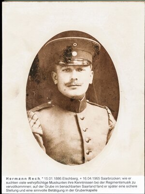 Hermann Rech, * 15.01.1886 Etschberg, + 16.04.1965 Saarbrücken; wie er suchten viele wehrpflichtige Musikanten ihre Kenntnisse bei der Regimentsmusik zu vervollkommnen; auf der Grube im benachbarten Saarland fand er später eine sichere Stellung und eine sinnvolle Betätigung in der Grubenkapelle. (PE)