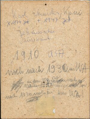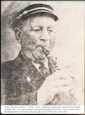 Karl Schneider, * 1874, + 1947, Jettenbach; geachteter Jettenbacher Kapellmeister, der – wie viele Kollegen des großen Musikantendorfes – die amerikanischen Bundesstaaten als Reiseziel bevorzugte; nach 1930 noch in den USA! (PE)