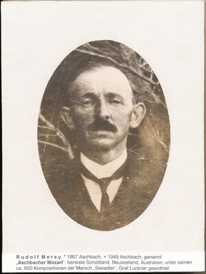 Rudolf Mersy, * 1867 Aschbach, + 1949 Aschbach; genannt „Aschbacher Mozart”, bereiste Schottland, Neuseeland, Australien; unter seinen ca. 600 Kompositionen der Marsch „Seeadler“, Graf Luckner gewidmet. (PE)