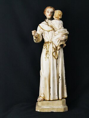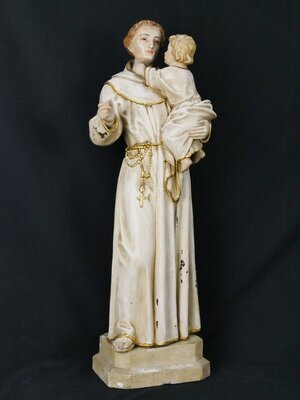 Figur des Heiligen Antonius von Padua. Der Heilige ist in der typischen Darstellung dargestellt. Er trägt die Franziskanerkutte, einen Rosenkranz, und auf dem rechten Arm das Jesuskind auf einem Buch. Letzteres ist nicht zu sehen, da es von dem Gewand des Jesuskinds umhüllt ist. Die Kutte und das Gewand des Jesuskinds sind weiß bemalt, der Rosenkranz und die Gewandsäume sind vergoldet. Die Lippen sind rot und die Haare hellbraun. Die Bemalung hat mehrere Abplatzungen, an denen man die dunkelbraunrote Farbe der Keramik sieht. Die Figur steht auf einem Sockel mit mehreren Abstoßungen. Die Lilie die der Heilige in der rechten Hand hielt ist leider abgängig. Auf der Rückseite ist in Kragenhöhe ein produktionsbedingtes ein Loch zu sehen. Eine sehr ähnliche Steinfigur befindet sich in der Liebfrauenkirche in Gent (siehe Links). Diese ziert auf ca 2 Meter Höhe die Kirchenwand, Dies könnte auch für unsere Figur der ursprüngliche Platz gewesen sein.