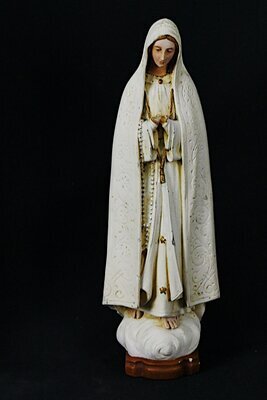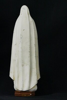 Stark verkleinerte Nachbildung der Madonna Fatima. Bei den Marienerscheinungen von Fátima handelt es sich um sechs Erscheinungen einer „weißen Dame“ vor drei Hirtenkindern in Fátima, einem kleinen Dorf in Portugal im Jahr 1917. Die Statue steht auf einer weißen Wolke. Diese wiederum liegt auf einem braun glasiertem Sockel. Die Madonna trägt weiße Kleider in 3 Schichten. Die äußerste Schicht ist ein über den Kopf gehender mit reliefartigen Ornamenten verzierter Mantel. Die innerste Schicht ist mit goldenen Sternen geschmückt. Am rechten Arm hängt ein Rosenkranz. Der Madonna fehlen die betenden Hände. Ansonsten ist sie nahezu unbeschädigt. Die kleine Statue ist möglicherweise ein Mitbringsel von einer Pilgerreise.