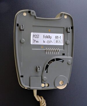Unter den vielen Bauformen des FeTAp 61 (insgesamt über 250) war auch eine Ausführung als Wandapparat mit der Bezeichnung FeWAp 61 der erst 1967, also 4 Jahre nach dem Tischmodell, eingeführt wurde. Er wurde in wesentlich geringerer Anzahl als die Tischvariante hergestellt und auch im Gegensatz zu dieser, wurde er ausschließlich in grau hergestellt. Unser Objekt wurde von SEL Standard Elektrik Lorenz im Juli 1975 hergestellt. 1963 führte die Deutsche Bundespost die 61 Serie ein. Sie war eine Neuentwicklung und Nachfolger des legendären W 48 Modells. Kompakter und handlicher als sein Vorgänger. Alle Gehäuseteile, sowie der Handapparat, wurden nun aus hochschlagfestem ABS-Kunststoff hergestellt. Die Fingerlochscheibe wurde durchsichtig..