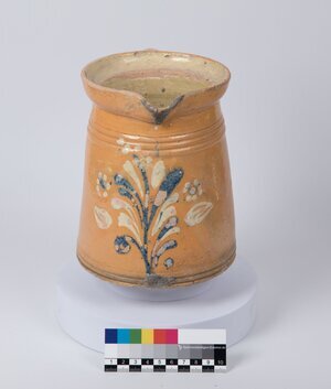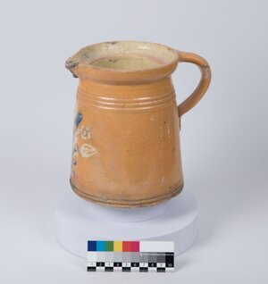 Krug aus brauner Tonerde mit Blumenmotiv