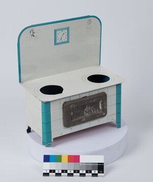 Kinderspielzeug, Blech, dreiteilig, bestehen aus einem Ofen, einer Küchenwaage und einer Kehrschaufel