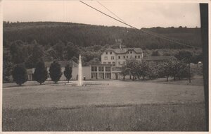 Die Ansichtskarte als Bunddruck ist ein Luftbild aus westlicher Richtung aufgenommen. Der Pavillon am Eingang zum Kurpark ist teilweise von einem weitausladenden Baum verdeckt. Hinter dem Pavillon führt ein breiter Weg zur Trinkhalle und die Gebäude links der Trinkhalle beherbergen das Kohlensäure-Werk und das Kurmittelhaus. Hinter diesen Gebäuden ist noch der kleine Kurpark mit dem Weg zu dem auf dem Hang stehenden Kurhotel zu erkennen. Der Wald rechts vom Kurhotel gehört zum Mühlenberg.