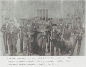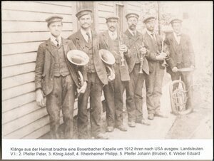 Kapelle Jakob Pfeifer, Hundheim, in England um 1910 / V.l.: 1. Pfeifer August, Geige; 2. Pfeifer Jakob, Flöte; 3. unbekannt, Kontrabass; 4. Bauss Philipp, Klarinette; sitzend: Deimling Paul, Trompete. (PE)