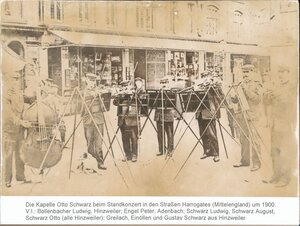 Die Kapelle des Otto Schwarz, Hinzweiler, beim "Ständeln" in den Straßen Harrogates (Mittelengland) um 1900. V.l.: Bollenbacher Ludwig, Hinzweiler, Engel Peter, Adenbach, Schwarz Ludwig, Hinzweiler, Schwarz August, Hinzweiler, Schwarz Otto, Hinzweiler, Greilach, Einöllen, Schwarz Gustav, Hinzweiler. (PE)
