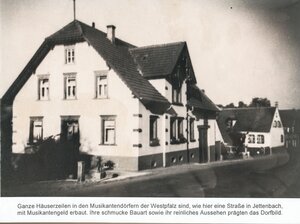 Ganze Häuserzeilen in den Musikantendörfern der Westpfalz sind, wie hier eine Straße in Jettenbach, mit Musikantengeld erbaut. Ihre schmucke Bauart sowie ihr reinliches Aussehen prägten das Dorfbild. (PE)