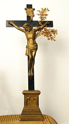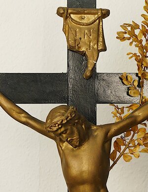 Großes Standkreuz (Kruzifix) mit Buchsbaumzweig