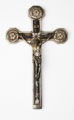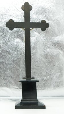 Das stehende Kruzifix ist aus Holz und Gips gefertigt - das Kreuz aus schwarz gebeiztem Holz. Die Enden des Kreuzes sind typisch neugotisch mit 3 Passen versehen. Der Korpus ist aus weiß gefasstem Blech gefertigt. Die Blutspuren aus allen Wunden und von unterhalb der Dornenkrone sind rot, Haare und Dornenkrone sind mit brauner Farbe gemalt. Die Arme sind schräg nach oben ausgestreckt. Der Rechte Arm besitzt an der Schulter eine geklebte Bruchstelle. Die Füße stehen übereinander auf einer Konsole. Über dem Korpus hängt der Titulus crucis (die INRI-Tafel) aus bemaltem Blech. Hinter dem Kopf des Korpus befindet sich ein goldfarbener strahlenförmiger Nimbus (Heiligenschein). Der Totenkopf (Schädel des Adam) unterhalb des Korpus ist nur teilweise erhalten und hängt schief. Möglicherweise hing zwischen Korpus und Totenkopf noch ein Lamm, das abgängig ist.