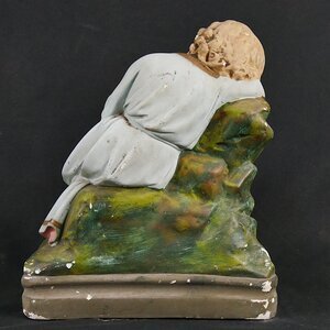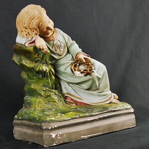 Die farblich gefasste Gipsfigur zeigt das schon etwas ältere Jesuskind schlafend mit dem rechten Arm und dem Kopf auf einem Felsen gestützt. Es trägt einen hellblauen Mantel mit Goldstreifen. Auf seiner Brust befindet sich in einer goldumrahmten Kartusche sein "ihs" Monogramm. In der linken Hand hält Jesus die Dornenkrone. Vor dem Felsen wächst eine Pflanze, die als Relief vor dem Felsen angedeutet ist. Die ganze Plastik steht auf einem graubraunem Sockel. Fatalerweise sind Felsen und Pflanzen (und auch der Boden) mit der gleichen grün-gelben Farbe angemalt, sodass sie schwer voneinander zu unterscheiden sind. Die Figur hat Beschädigungen an der Dornenkrone und einem Zeh. Desweitern existieren mehrere Farbabplatzungen. Die Darstellung scheint sehr beliebt gewesen zu sein. Angebote auf Kleinanzeigenplattforen für gibt es zwischen 30€ und 150€ (Sept. 2023). Neben vom Guss identischen Figuren - bei denen der Fels meist dunkelbraun bemalt ist - existieren auch in Details unterschiedliche Gipsgüsse mit einem unterschiedlich geformten Fels, Kreuz statt Dornenkrone, einer anderen Kopfhaltung sowie mit 2 Tauben, die aus einer im Fels entspringenden Quelle trinken. Leider konnte nicht herausgefunden werden, welche Szene hier dargestellt wird. Naheliegend wäre hier die Erzählung der Rast auf der Flucht nach Ägypten im Pseudo-Matthäusevangelium aus den Apokryphen. Aber 100%ig passt das leider auch nicht... Möglicherweise gehört die Figur zur Szene "Flucht nach Ägypten" einer Weihnachtskrippe.