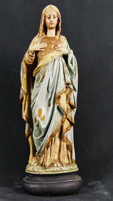 Gipsstatue mit der Darstellung des unbefleckten Herzens Marias. Die Statue steht auf einem schwarzen Sockel. Maria trägt ein goldfarbenes Kopftuch, eine ebenfalls goldfarbene Tunika mit goldenen Rändern und über dieser ein mit Pflanzenmotiven verziertes Tuch in blauer Farbe. Auf ihrer Brust befindet sich ein goldenes mit einem Dolch durchstoßenes Herz in einem ebenfalls goldenen Strahlenkranz. Maria steht auf einer stark zusammengedrückten Wolke. Die Statue zeigt viele Abplatzungen, an nicht wenigen Stellen bröselt der Gips und die Farben zeigen Abriebstellen. Die Figur ist auch nach vorsichtiger Reinigung stark verschmutzt und insgesamt in einem ziemlich schlechten Zustand. Die Herz-Mariä-Verehrung richtet sich auf Maria, die Mutter Jesu, als Person, die sich Gott und den Menschen widmete und dem Heilswerk ihres Sohnes unterordnete. Die Herz-Maria-Verehrung geht bis auf die Kirchenväter zurück und kam insbesondere im 17. und im 19. Jahrhundert zusammen mit der Verehrung des Herzen Jesu zur Blüte.