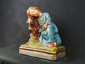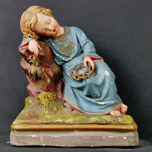 Die farblich gefasste Gipsfigur zeigt das schon etwas ältere Jesuskind schlafend mit dem rechten Arm und dem Kopf auf einem Felsen gestützt. Es trägt einen blauen Mantel mit Goldstreifen. Auf seiner Brust befindet sich in einer goldumrahmten Kartusche sein "ihs" Monogramm. In der linken Hand hält Jesus die Dornenkrone. Vor dem rotbrauen Felsen wächst eine Pflanze mit grünen Blättern, die als Relief vor dem Felsen angedeutet ist. Unter der Figur ist eine grüne Wiese. Die ganze Plastik steht auf einem grauen Sockel. Die Figur hat an Beschädigungen 2 Chips und mehrere Abplatzungen. Die Darstellung scheint sehr beliebt gewesen zu sein. Angebote auf Kleinanzeigenplattforen für gibt es zwischen 30€ und 150€ (Sept. 2023). Neben vom Guss identischen Figuren existieren auch in Details unterschiedliche Gipsgüsse mit einem unterschiedlich geformten Fels, Kreuz statt Dornenkrone, einer anderen Kopfhaltung sowie mit 2 Tauben, die aus einer im Fels entspringenden Quelle trinken. Leider konnte nicht herausgefunden werden, welche Szene hier dargestellt wird. Naheliegend wäre hier die Erzählung der Rast auf der Flucht nach Ägypten im Pseudo-Matthäusevangelium aus den Apokryphen. Aber 100%ig passt das leider auch nicht... Möglicherweise gehört die Figur zur Szene "Flucht nach Ägypten" einer Weihnachtskrippe.