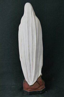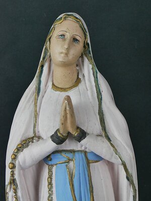 Die Figur ist eine Nachbildung der Gnadenmadonna deren Original Joseph-Hugues Fabisch 1864 nach den Angaben Bernadettes für die Grotte von Massabielle bei Lourdes (Südfrankreich) schuf. Das Original steht an der Stelle der Grotte an der an der heilige Bernadette nach eigenen Angaben die Muttergottes sah. Die Figur hat die Standardform einer Lourdes Madonna. Die schlanke, überlange Figur der Madonna ist farbig gefasst. Sie trägt ein jeweils mit Goldrändern verziertes weißes Gewand und einen hellblauen Gürtel. Im rechten Ellenbogen hängt ein goldfarbener Rosenkranz mit einem Kreuz. Die Hände sind in Gebetshaltung auf die Brust gelegt. Der Kopf ist in verklärter Haltung himmelwärts gerichtet. Unter dem Mantel sind die beiden Füße zu sehen. Auf den Füßen liegt je eine goldenen Rose. Sie stehen auf einem hellrotbraunen mit Rosenranken überwachsenen Erdhügel. Dieser wiederum auf einem schwarzen Sockel. Die Bedeutung der Lourdes Madonna und der damit einhergehenden Wallfahrt geht auf die Erscheinung von 1858 zurück als die heilige Bernadette nach eigenen Angaben die Muttergottes in einer Grotte in Lourdes sah. Typischerweise wurden diese Figuren in verkleinerten Nachbildungen der Grotte von Lourdes gezeigt. Diese befinden sich auf Kirchhöfen oder als Flurdenkmal an einer Wegkreuzung, am Feldrand oder im Wald errichtet. Allein in Deutschland sind rund 200 Lourdesgrotten bekannt. Kleinere, von Privatpersonen errichtete Lourdesgrotten entstanden häufig aufgrund privater Gelübde, oft in Verbindung mit einer Wallfahrt nach Lourdes und erfolgter Heilung von Krankheit oder als Dank für die unbeschadete Heimkehr aus dem Krieg oder Rettung aus Gefahr. Die von unserem Museum aus nächstgelegene Lourdesgrotte befindet sich oberhalb des Ortes Ayl im Saartal: 49.626351. 6.555577