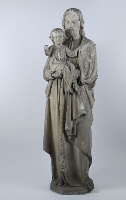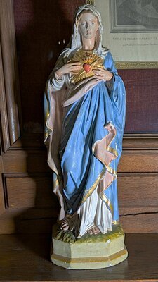 Gipsfigur mit der Darstellung von Maria mit Kind als Maria Königin. Maria trägt mit der rechten Hand das Jesuskind. Sie trägt von innen nach außen eine weiße faltenreiche Tunika, darüber ein ockerfarbenes mit goldenen Sternen übersätes Kleid und darüber einen außen hellblauen und innen roten Mantel, die beiden letzteren mit goldenen Bändern. Der Mantel wird auf Brusthöhe mit einer Fibel zusammengehalten. Maria trägt eine Krone, das Jesuskind ist weiß gekleidet. Die Rechte Hand der Maria einschließlich des dort wahrscheinlich vorhandenen Zepters sowie die Arme und Hände des Jesuskinds sind leider abgängig.