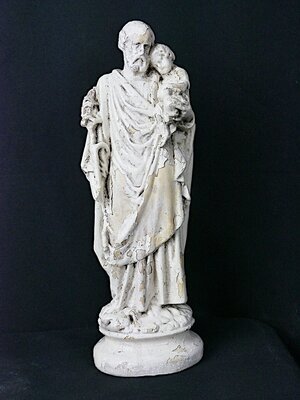 Figur des Heiligen Josef mit Lilie und dem Jesuskind. Die Figur ist aus Keramik und farbig gefasst. Der hl. Josef trägt Bart, gekräuseltes Haar, ein violettes Gewand das von einem rotbraunem Tuch mit Liliensymbolen umschlungen wird. Er steht mit beiden an der Spitze sichtbaren Füßen auf angedeuteten Steinen die sich auf einem flachen Sockel befinden. In seiner linken Hand hält er eine Lilie. Die Lilie in der Hand von Josef weist auf dessen Reinheit und Unschuld im Zusammenhang mit der Geburt Jesu hin. In der rechten Hand trägt er das Jesuskind. Dieses schläft, sitzt aufrecht und lehnt sich mit Kopf und Händen an den Kopf und die Schulter von Josef an. Die Figur hat einige wenige kleine Farbabplatzer und ist in einem guten Zustand.