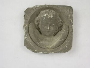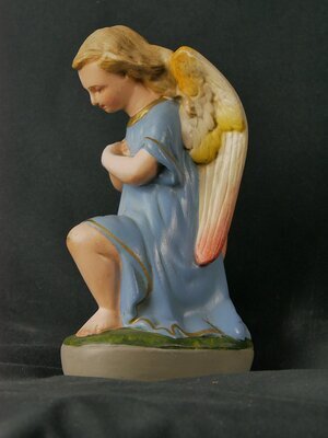 Kleiner Engel mit blauen, kurzem Kleid und golden- weißen Flügeln. Der Engel sitzt auf einer runden grünen Wiese, die wiederum auf einem grauen runden Sockel ruht. Der Engel hat in Anbetehaltung die beiden Hände vor der Brust. Wahrscheinlich ursprünglich Bestandteil einer Weihnachtskrippe oder eines Altars. Zum Zeitpunkt der Inventarisierung (Oktober 2024) wurden mehrere unterschiedlich bemalte Engel dieses Typ auf den Gebrauchtwaren-Servern angeboten.