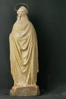 Der Heilige Erasmus von Antiochia war Bischof von Antiochien und ein Märtyrer. Die Figur ist aus Keramik und farbig gefasst. Er trägt eine Mitra auf und den Heiligenschein hinter dem Kopf. Der hl. Erasmus trägt Bart, gekräuseltes Haar, ein rotbrauner Gewand das von einem hellgelben mit Goldstreifen gefasstem Tuch teilweise überdeckt wird. In der rechten Hand hält er eine Winde mit den ihm beim Martyrium entwundenen Eingeweiden. Erasmus ist einer der 14 Nothelfer und gilt als Patron der Drechsler und Seeleute und als Helfer gegen Unterleibserkrankungen. Er steht mit beiden an der Spitze sichtbaren Schuhen auf der angedeuteten Erde. Die Figur ist in einem sehr guten Zustand.
