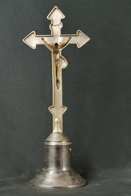 Standkreuz aus dem Ende des 19. Jahrhunderts oder dem Anfang des 20. Jahrhunderts. Möglicherweise auch als Sterbekreuz genutzt. Das Kreuz - meist in Form eines Lazaruskreuzes mit Kleeblättern an den Enden der Balken - ist ein religiöser Gegenstand der katholischen Kirche. Es wurde dem Sterbenden gezeigt oder gereicht. Durch den Verweis auf Lazarus soll dem Sterbenden die Verheißung auf die Auferstehung verdeutlicht werden. Das Kreuz einschließlich Korpus und einschließlich aller anderen Teile ist aus einem Stück gegossen. Sowohl beim Längs- wie auch beim Querbalken ist die Oberfläche mit Ausnahme schmaler Ränder in Holzimitation gestaltet. Diese ersetzt das bei den meisten Sterbekreuzen eingelassene schwarze Holz. In Weiterentwicklung der neugotischen Passen (Kleeblättern) finden sich an den Enden der Balken spitze Dreiecke. Am Kreuzpunt der Balken befindet sich ein zwölfzackiger strahlenförmiger Nimbus (Heiligenschein) über dem Kopf Christi. Die Arme sind im 45° Winkel nach oben gestreckt. Die Füße sind übereinander auf die Konsole genagelt. In allen Fällen sind die Nägel nur angedeutet. Über dem Korpus befindet sich auf einem geschwungenem Band der Titulus crucis (die INRI-Tafel).