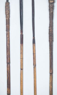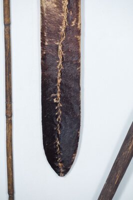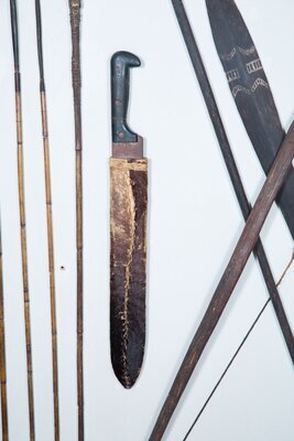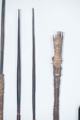 Waffen, mitgebracht von Philipp Hubrich (1863-1943) aus Neuseeland: Bogen, Speere, Schirrholz