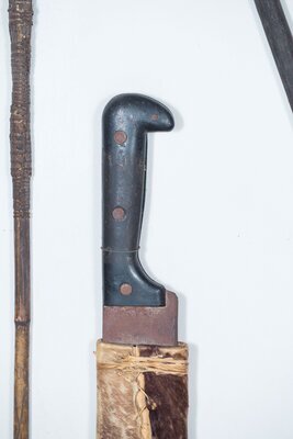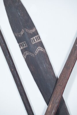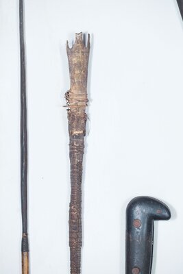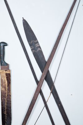 Waffen, mitgebracht von Philipp Hubrich (1863-1943) aus Neuseeland: Bogen, Speere, Schirrholz