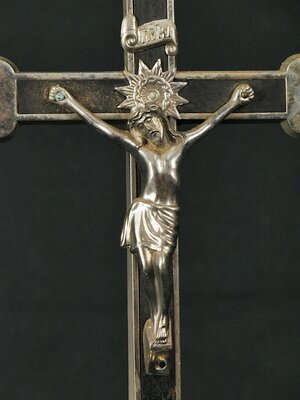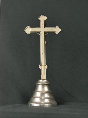 Sterbekreuz (Standkreuz) aus dem 19. Jahrhunderts. Das Kreuz - meist in Form eines Lazaruskreuzes mit Passen (Kleeblättern) an den Enden der Balken - ist ein religiöser Gegenstand der katholischen Kirche. Es wurde dem Sterbenden gezeigt oder gereicht. Durch den Verweis auf Lazarus soll dem Sterbenden die Verheißung auf die Auferstehung verdeutlicht werden. Das Standkreuz ist aus Metall gefertigt. In Längs- und Querbalken wurde schwarz lackiertes Holz eingelegt. Die Enden des Kreuzes sind typisch neugotisch mit 3 Passen versehen. Am unteren Ende des Längsbalkens ist dieser angedeutet. Der Korpus und der Ständer sind aus Neusilber gefertigt. Die Arme sind im etwa 30° Winkel schräg nach oben ausgestreckt. Die Füße stehen übereinander auf einer Konsole. Über dem Korpus hängt der Titulus crucis (die INRI-Tafel) in der Form eines geschwungenen Bands. Hinter dem Kopf des Korpus befindet sich ein strahlenförmiger Nimbus (Heiligenschein). Der rechte Arm des Korpus war wohl einmal abgebrochen und wurde wieder angeschweißt. Der kegelförmige wulstige Ständer hat vier Stufen.