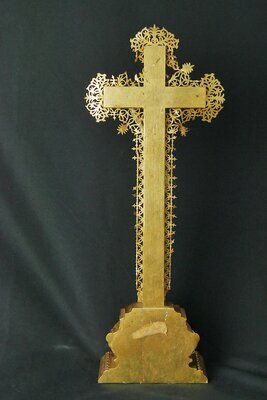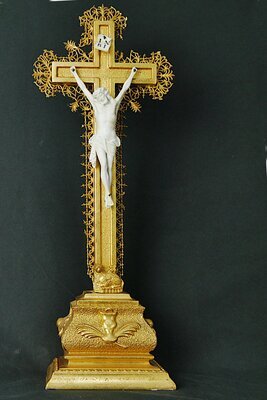 Französisches Kruzifix aus dem 19. Das stehende Kreuz hat einen Metallrahmen um einen Holzkern. Es besitzt einen durchbrochenen Fries aus Messing und ist komplett mit Goldbronze (?) gestrichen. Der Corpus ist aus Biskuit (-Keramik) gefertigt. Die Arme sind steil nach oben ausgestreckt. Die beiden Füße sind übereinandergelegt und mit einem einzigen Nagel am Kreuz fixiert. Oben am Längsbalken hängt der Titulus crucis (die INRI-Tafel) in Form einer römischen Feldstandarte wobei dieser mit einem Nagel am Kreuz befestigt ist. Der Sockel ist aus Holz zeigt einen Kelch zwischen Palmblättern in neobarocken Formen. Der Fries ist am Längsbalken oben rechts und unten beidseitig an ein paar eher kleinen Stellen abgängig. Im Korpus klafft unter der Achsel des rechten Arms ein kleines Loch.
