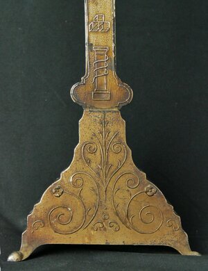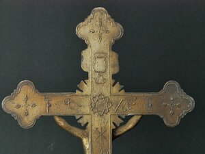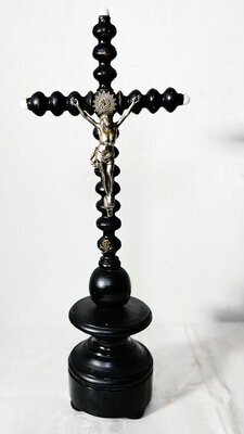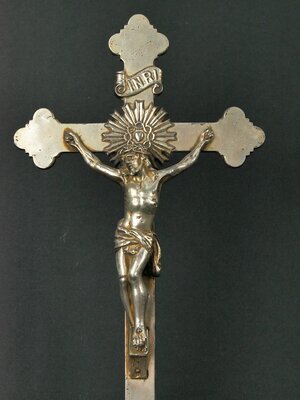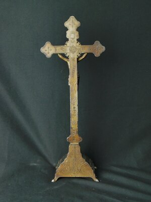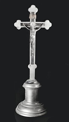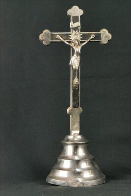 Sterbekreuz (Standkreuz) vom Ende des 19. Jahrhunderts. Das Kreuz in Form eines Lazaruskreuzes mit Passen (Kleeblättern) an den Enden der Balken - ist ein religiöser Gegenstand der katholischen Kirche. Es wurde dem Sterbenden gezeigt oder gereicht. Durch den Verweis auf Lazarus soll dem Sterbenden die Verheißung auf die Auferstehung verdeutlicht werden. Der Kreuz einschließlich des getreppten Sockels ist aus Metall. Der Kreuz ist versilbetem Metall gefertigt. Die Enden des Kreuzes sind typisch neugotisch mit 3 Dreipassen (Kleeblätter), die die Heilige Dreifaltigkeit darstellen, versehen. Am unteren Ende des Längsbalkens ist der Dreipass angedeutet Die Arme sind im etwa 30° Winkel schräg nach oben ausgestreckt. Die Füße stehen übereinander auf einer Konsole. Arme, Füße und die Konsole sind angenietet. Über dem Korpus hängt die INRI-Tafel in der Form eines geschwungenen Bands. Hinter dem Kopf des Korpus befindet sich ein strahlenförmiger Nimbus (der Heiligenschein) mit einem Herz in der Mitte. Unter der Konsole für die Füße befindet sich ein Totenkopf, der Titulus crucis (die INRI-Tafel), Heiligenschein und Totenkopf wurden zusammen mit dem Kreuz in einem Stück gegossen. Die Rückseite des Kreuzes ist mit einer Metallplatte verschlossen. Auf dieser befinden sich die von der Rückseite der Platte her eingepressten Symbole der Passionsgeschichte.