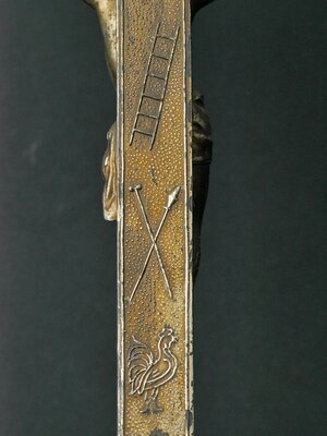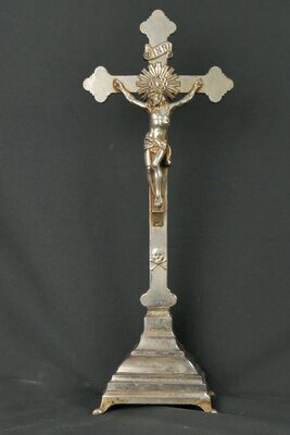 Sterbekreuz (Standkreuz) vom Ende des 19. Jahrhunderts. Das Kreuz in Form eines Lazaruskreuzes mit Passen (Kleeblättern) an den Enden der Balken - ist ein religiöser Gegenstand der katholischen Kirche. Es wurde dem Sterbenden gezeigt oder gereicht. Durch den Verweis auf Lazarus soll dem Sterbenden die Verheißung auf die Auferstehung verdeutlicht werden. Der Kreuz einschließlich des getreppten Sockels ist aus Metall. Der Kreuz ist versilbetem Metall gefertigt. Die Enden des Kreuzes sind typisch neugotisch mit 3 Dreipassen (Kleeblätter), die die Heilige Dreifaltigkeit darstellen, versehen. Am unteren Ende des Längsbalkens ist der Dreipass angedeutet Die Arme sind im etwa 30° Winkel schräg nach oben ausgestreckt. Die Füße stehen übereinander auf einer Konsole. Arme, Füße und die Konsole sind angenietet. Über dem Korpus hängt die INRI-Tafel in der Form eines geschwungenen Bands. Hinter dem Kopf des Korpus befindet sich ein strahlenförmiger Nimbus (der Heiligenschein) mit einem Herz in der Mitte. Unter der Konsole für die Füße befindet sich ein Totenkopf, der Titulus crucis (die INRI-Tafel), Heiligenschein und Totenkopf wurden zusammen mit dem Kreuz in einem Stück gegossen. Die Rückseite des Kreuzes ist mit einer Metallplatte verschlossen. Auf dieser befinden sich die von der Rückseite der Platte her eingepressten Symbole der Passionsgeschichte.