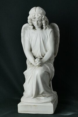 Kleiner weißer sitzender Friedhofsengel (Grabengel) aus Steinguss. Der Blick der geschlossenen Augen geht nach unten. Der Engel besitzt zwei große Flügel, trägt ein langes Kleid. Die auf dem Knie aufgestützten Hände sind zum Gebet gefaltet. Die Figur ist auf einem Sockel befestigt.